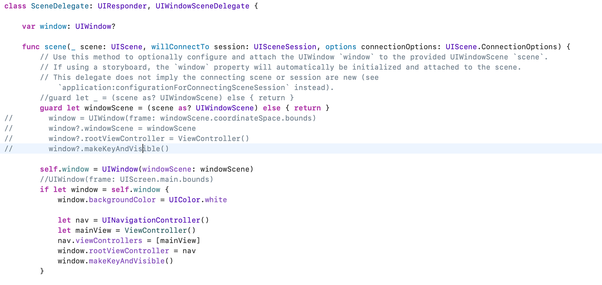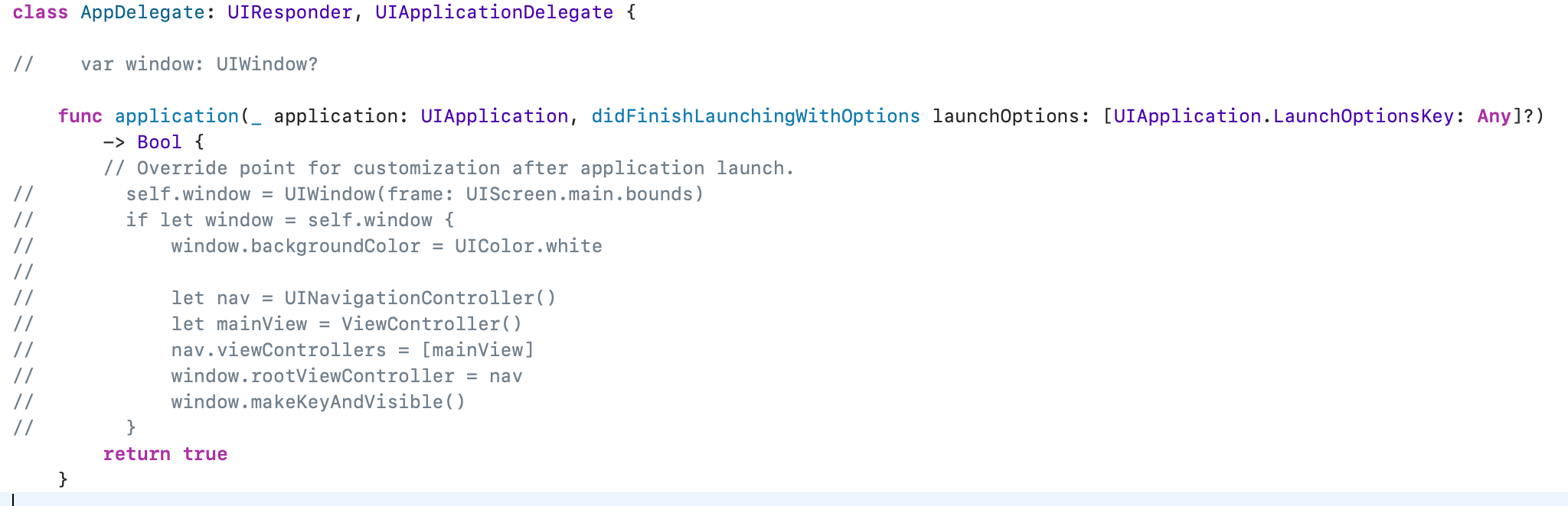 Navigation View와 일반 ViewController를 AppDelegate에서 만들었는데 이 부분이 iOS13이후 부터는 SceneDelegate로 넘어갔다고 한다. 그래서 SceneDelegate에서 작업해주기 위해 일단 App Delegate에서 주석처리하기,