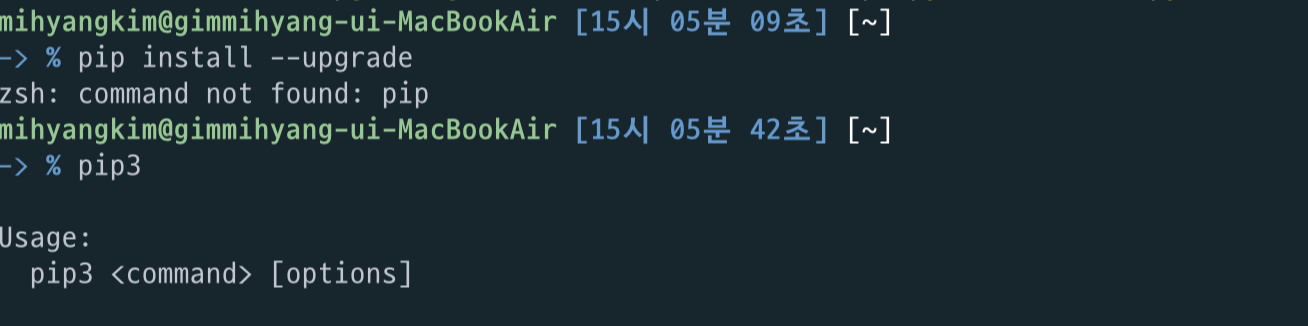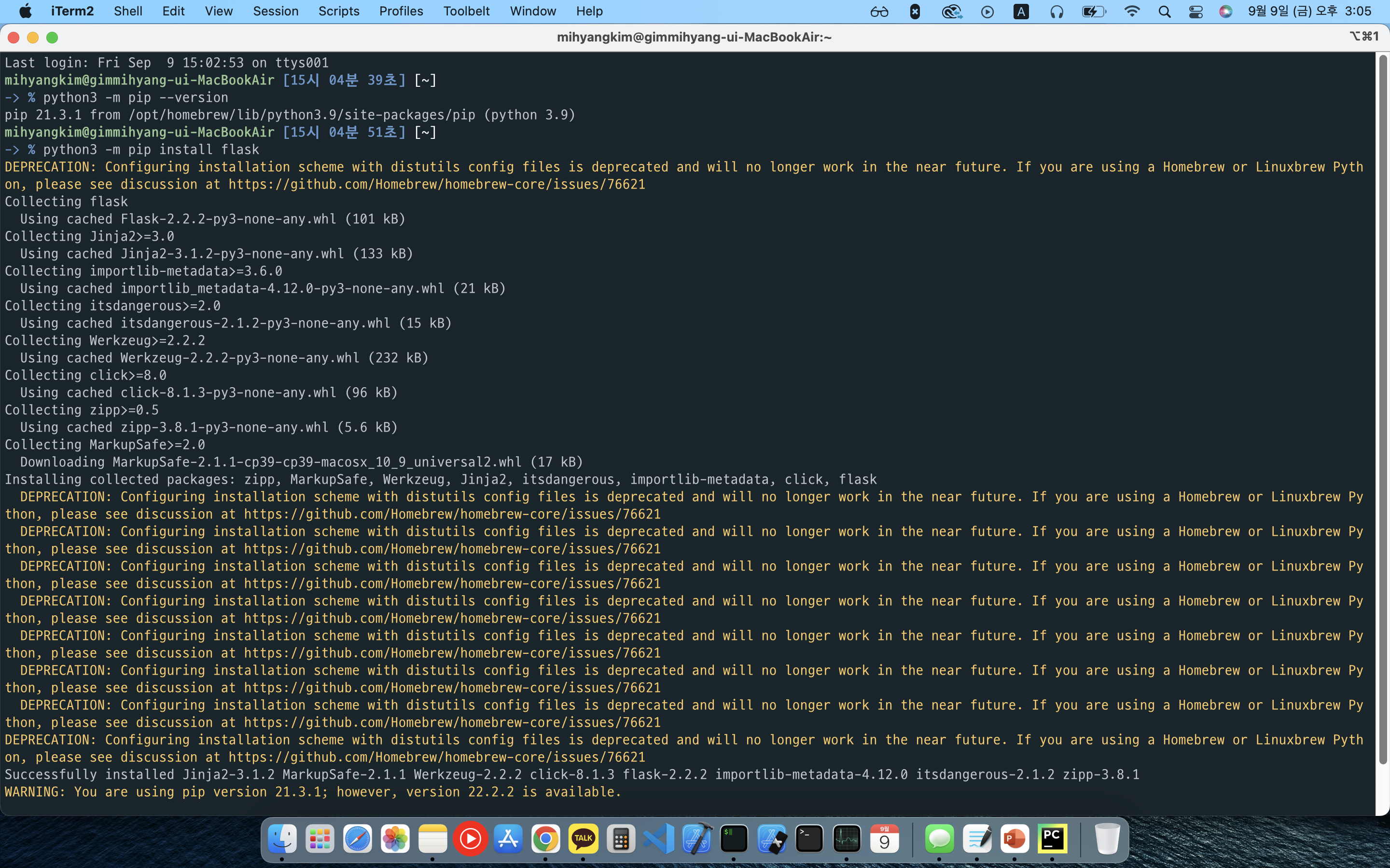 역시 python3로 설치하지 말고 Homebrew로 설치하라고 Deprecation 문구가 떴다. (예예. 구글링하기 귀찮아서 이번만요...선생님)