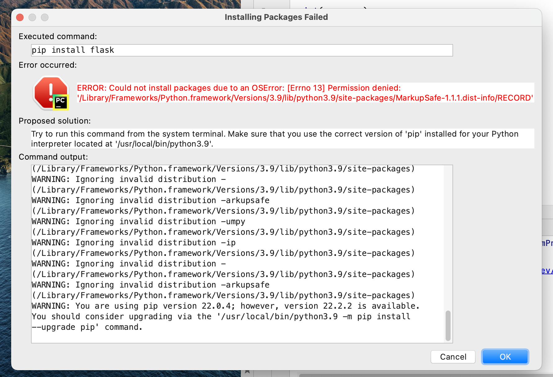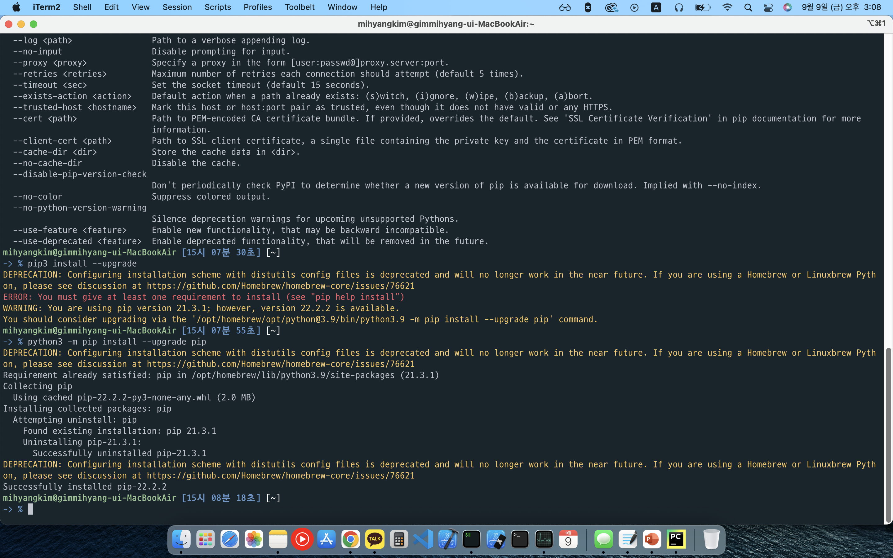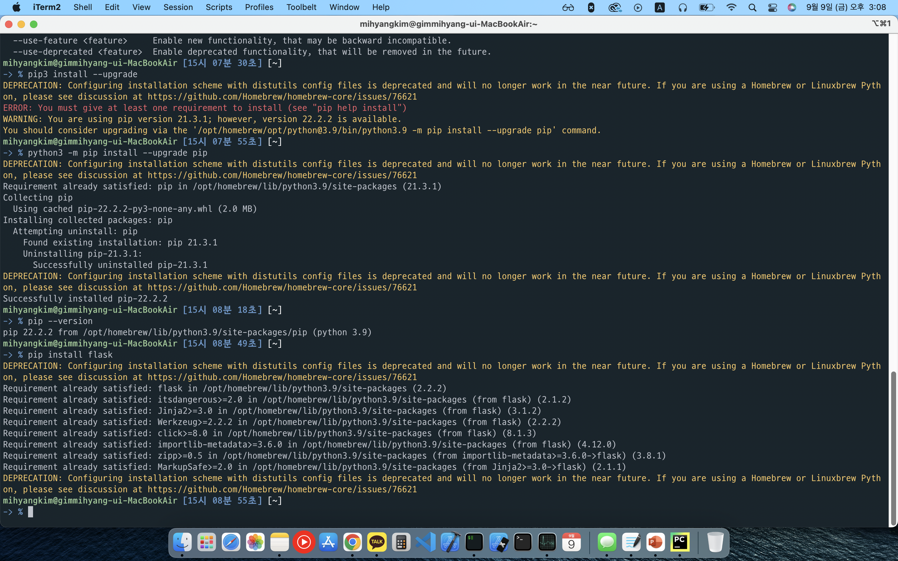 pip 로 설치하고 업그레이드 하는 게 되지 않았다. 요즘엔 주로 리눅스만 열심히 쓰다가 다시 맥으로 돌아왔는데 내 기억으로는 맥에서Python3.8 썼었는데, 오늘 보니 python3.9로 업데이트가 된 것 같다. 파이참 터미널에서 프레임워크 설치하다가 다음의 에러를 받았다.